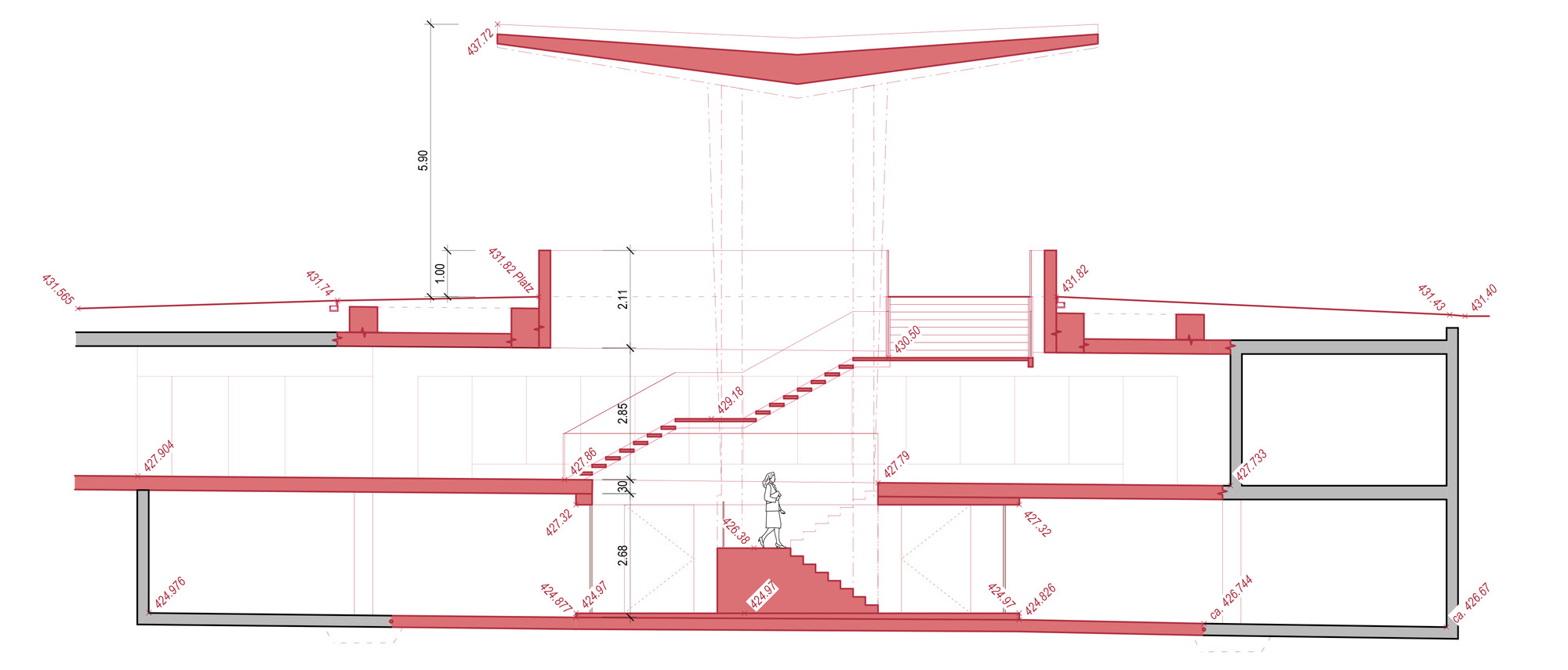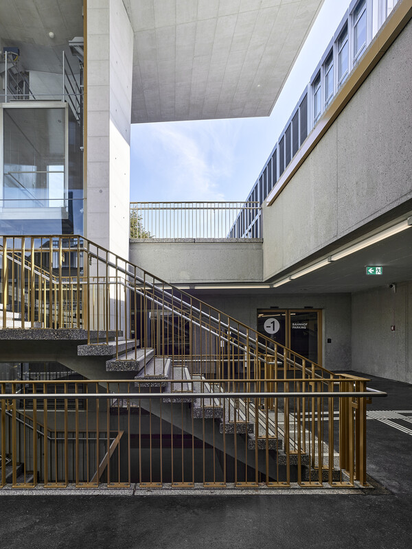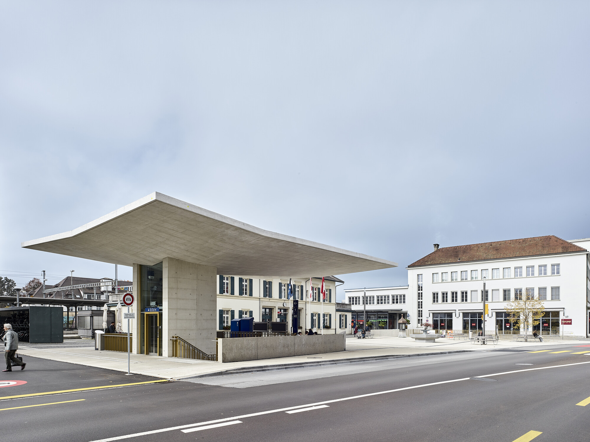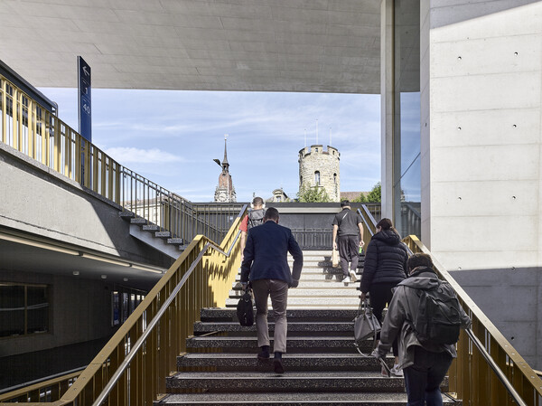Die Grunddisposition der Bahnhofsanlage ist sehr gut. Die öffentlichen Verkehrsträger sind aufeinander abgestimmt. Die Geleise sind mit drei Unterführungen erschlossen. Das Angebot an Abstellplätzen ist gross und auch die Veloparkplätze sind optimal an jedem Eingang angeordnet. Unser Konzept baut auf dem Bestand auf. Der Bahnhofplatz wird so befreit, dass die Erkennbarkeit der Fussgängerführung für die Bahnkunden wieder ersichtlich ist. Die Fusswege werden den neuen Bedürfnissen angepasst und verbreitert. Die Veloparkierung wird unter dem Bahnhofplatz angeordnet und direkt an die Unterführung angeschlossen und der zentrale Aufgang mit Lift und Treppe vergrössert und geöffnet. Ein einladendes Dach zeigt den Passanten den Eingang zur Hauptunterführung. Vor dem ehemaligen Bahnhofgebäude entsteht dadurch wieder ein richtiger Platz. Er dient als Treffpunkt, Aufenthalts- und Orientierungsort.